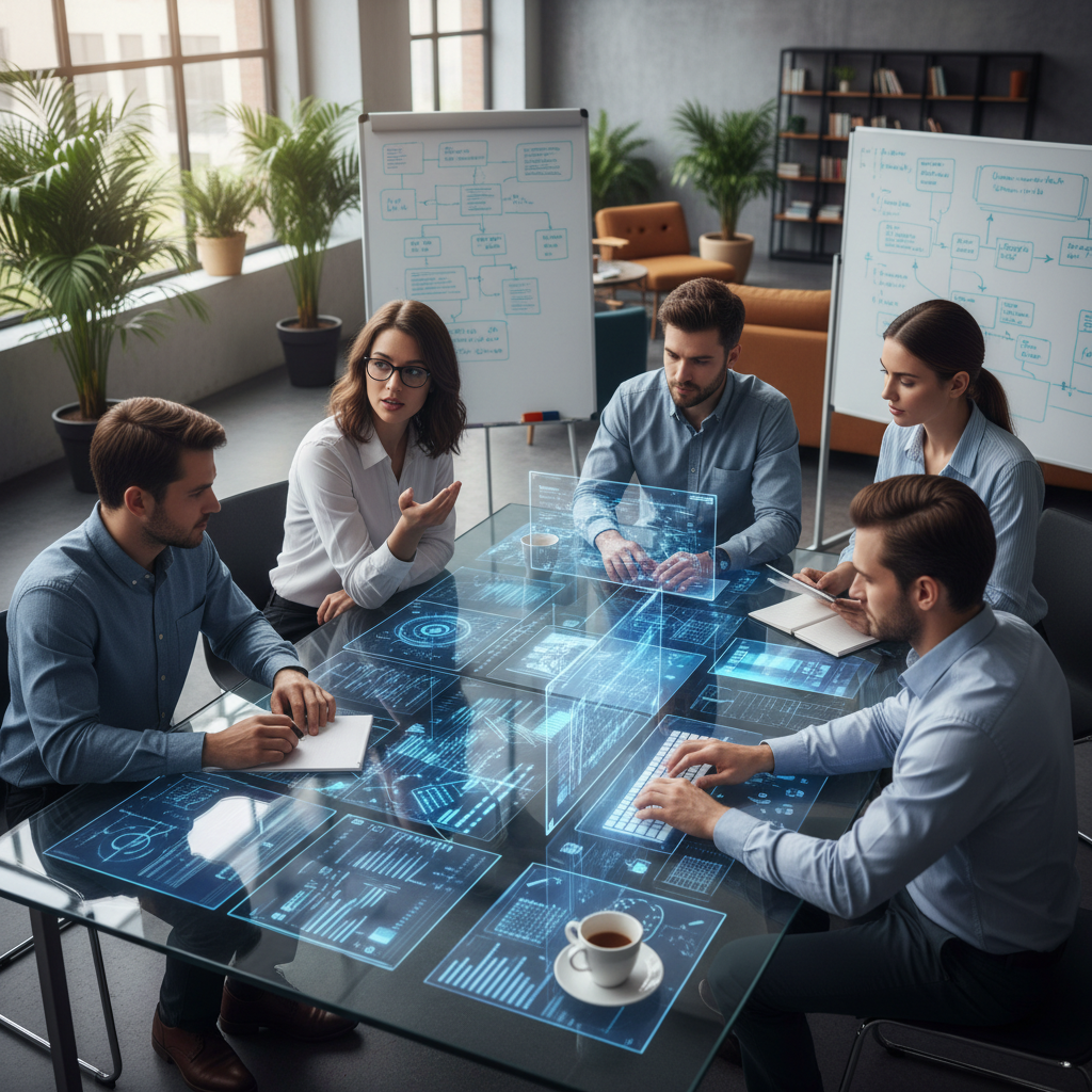Na zdjęciu: zespół specjalistów ds. AI analizuje dane na ekranach komputerów, ilustrując zaawansowany proces technologiczny stojący za nowoczesnymi wyszukiwarkami noclegów.