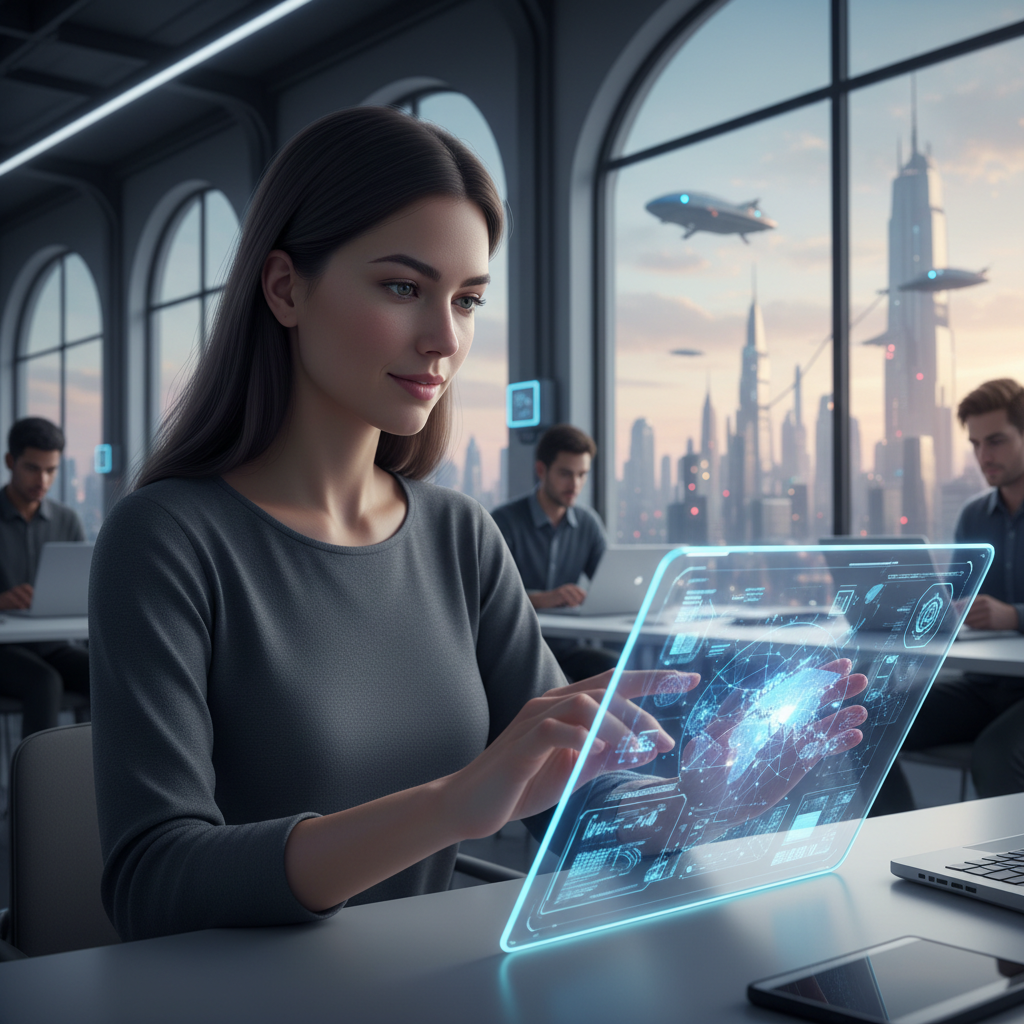 Na zdjęciu: kobieta korzysta z tabletu, na ekranie widać nowoczesny interfejs AI analizujący oferty noclegowe, co ilustruje praktyczne zastosowanie sztucznej inteligencji w turystyce.