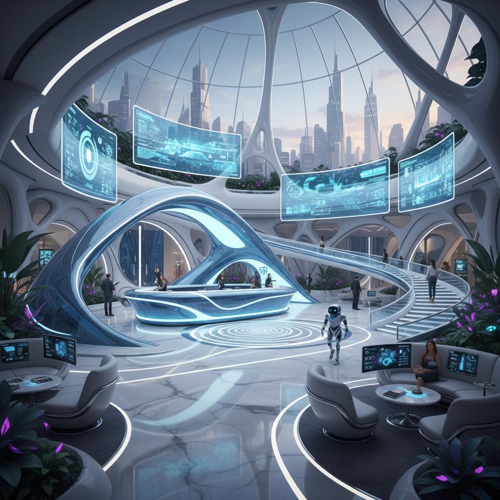 Futurystyczna wizja lobby Sheratona: technologia, design i gościnność.