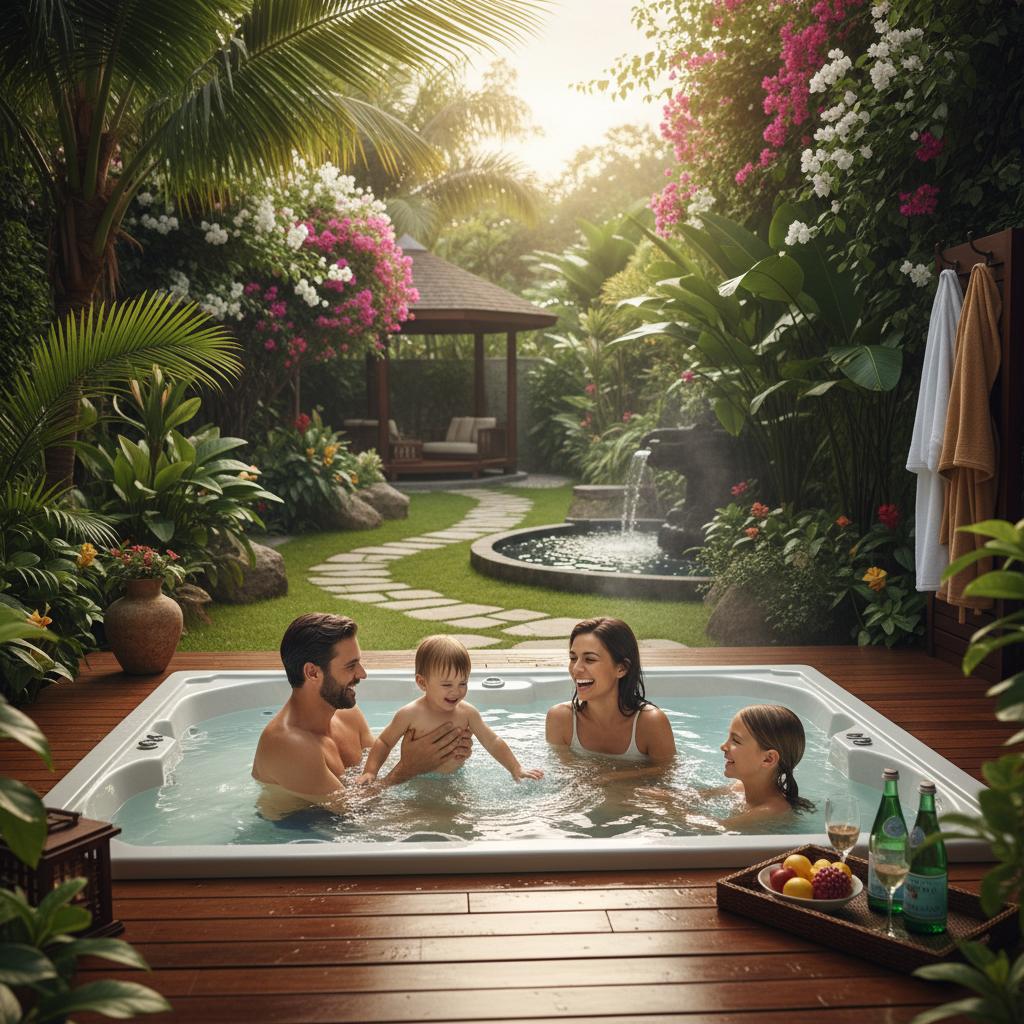 Rodzina korzystająca z prywatnego jacuzzi w ogrodzie domku – najwyższy poziom komfortu i intymności.